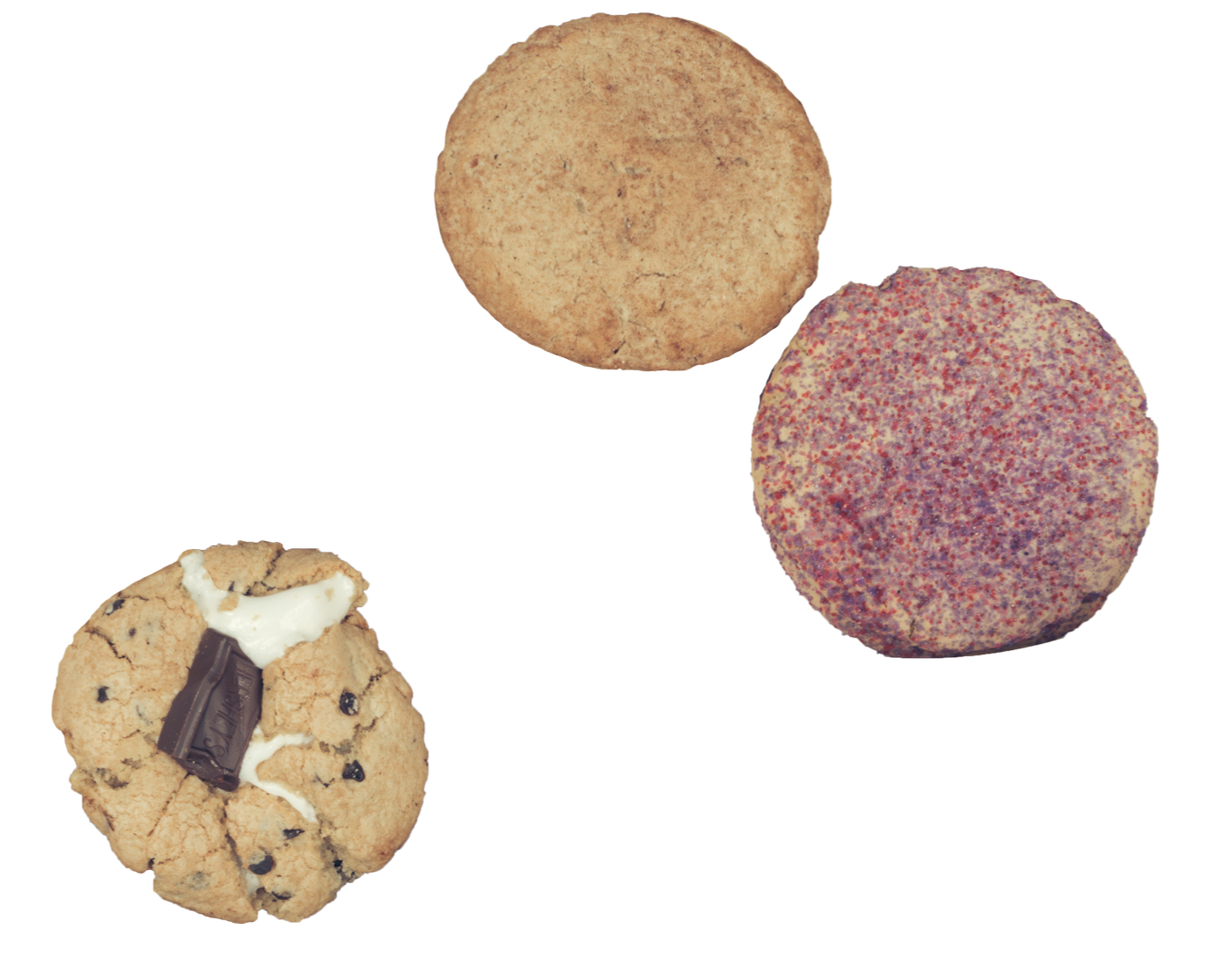 The S’mores cookie is a classic chocolate chip base stuffed with gluten-free graham cracker and marshmallow, baked until perfectly gooey and finished with a Hershey bar on top. The Fluffer Nutter puts a playful twist on the classic sandwich—it is a soft, chewy peanut butter dough base stuffed with marshmallow fluff.